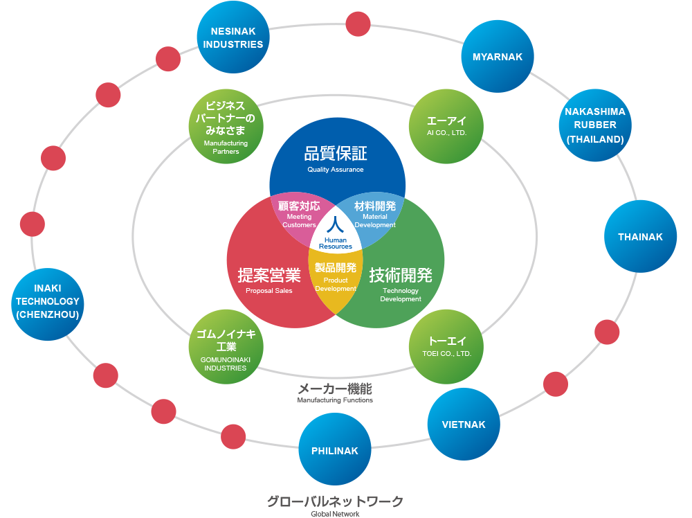 ゴムノイナキは商社でありながら、「研究開発機能」と「メーカー機能」を備えています。